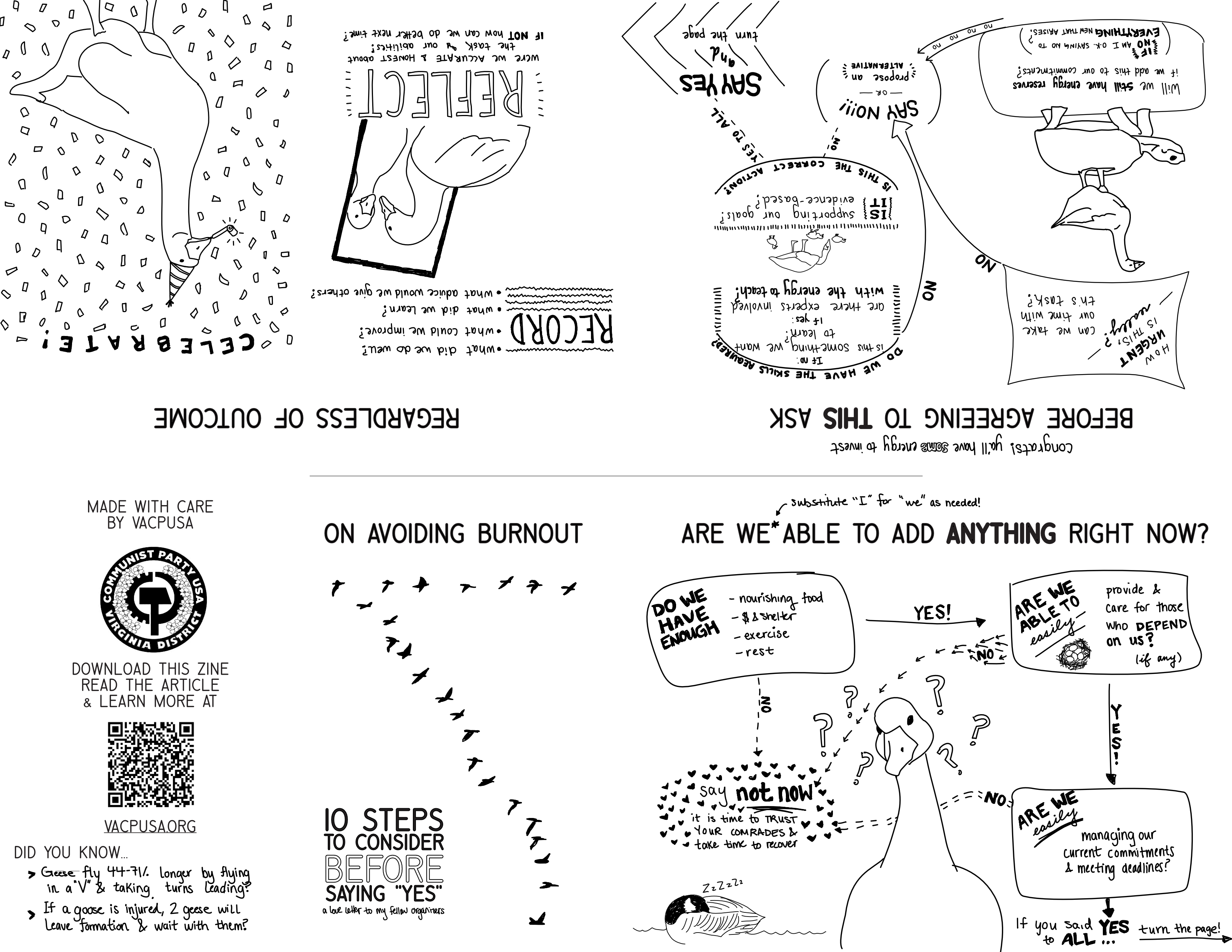 If you’re struggling with these things, it’s time to trust your comrades and say no for now. Cheer others on, recommend the action to another group or to up-and-coming folks within your organization, or just take the time you need to return to the struggle at a later date.